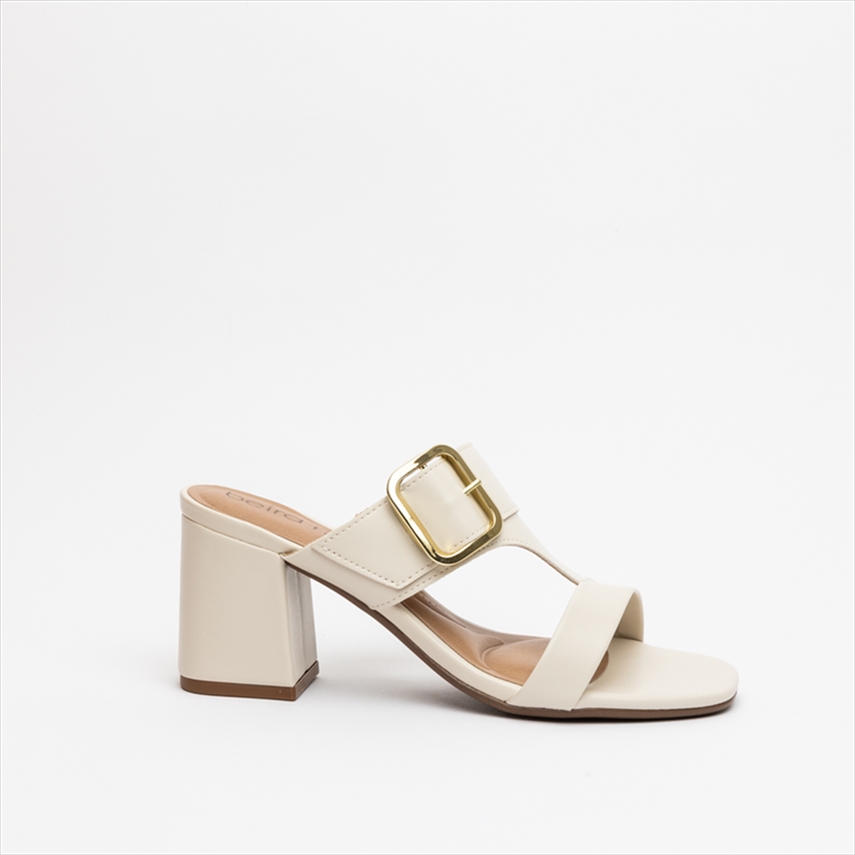 Beira Rio Medium Block Heel Mule Sandals with Gold Buckle Detail
