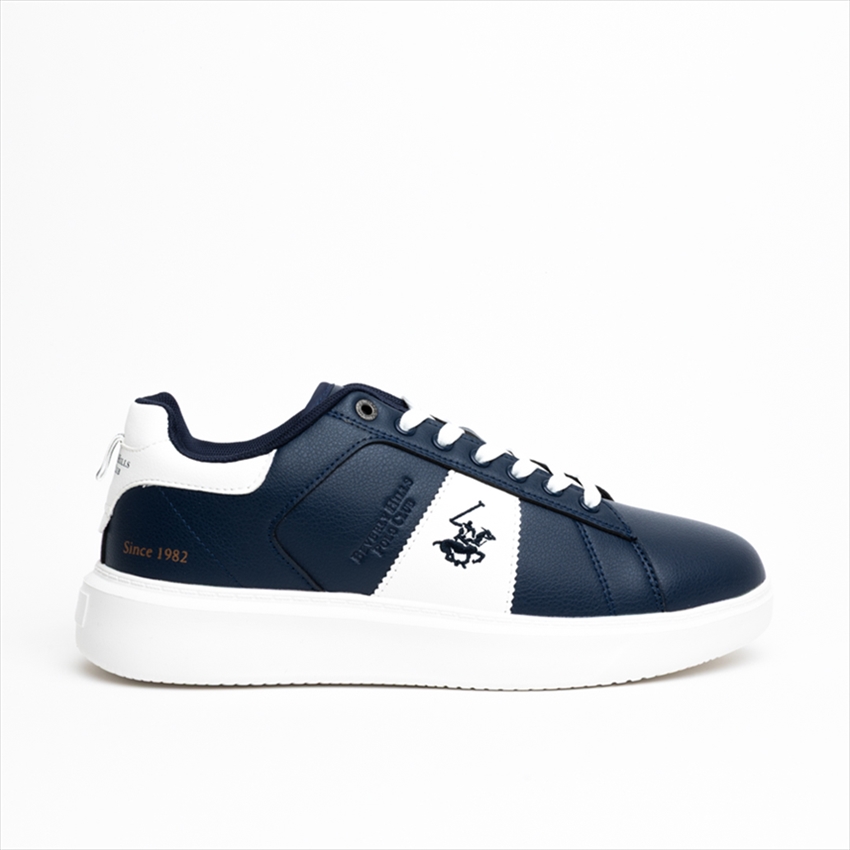 Step up your style game with these fashion-forward mens Beverly Hills Polo Club court sneakers. Designed with a classic lace-up closure and a clean court silhouette, these sneakers bring timeless streetwear appeal to any outfit. The rich navy upper is accented with bold white contrast detailing, giving them a sharp, modern edge. A standout emblem on the side adds signature flair, while the round toe keeps things sleek and comfortable. Whether youre hitting the streets or leveling up your casual look, these sneakers deliver everyday versatility with unmistakable style. Available in navy.