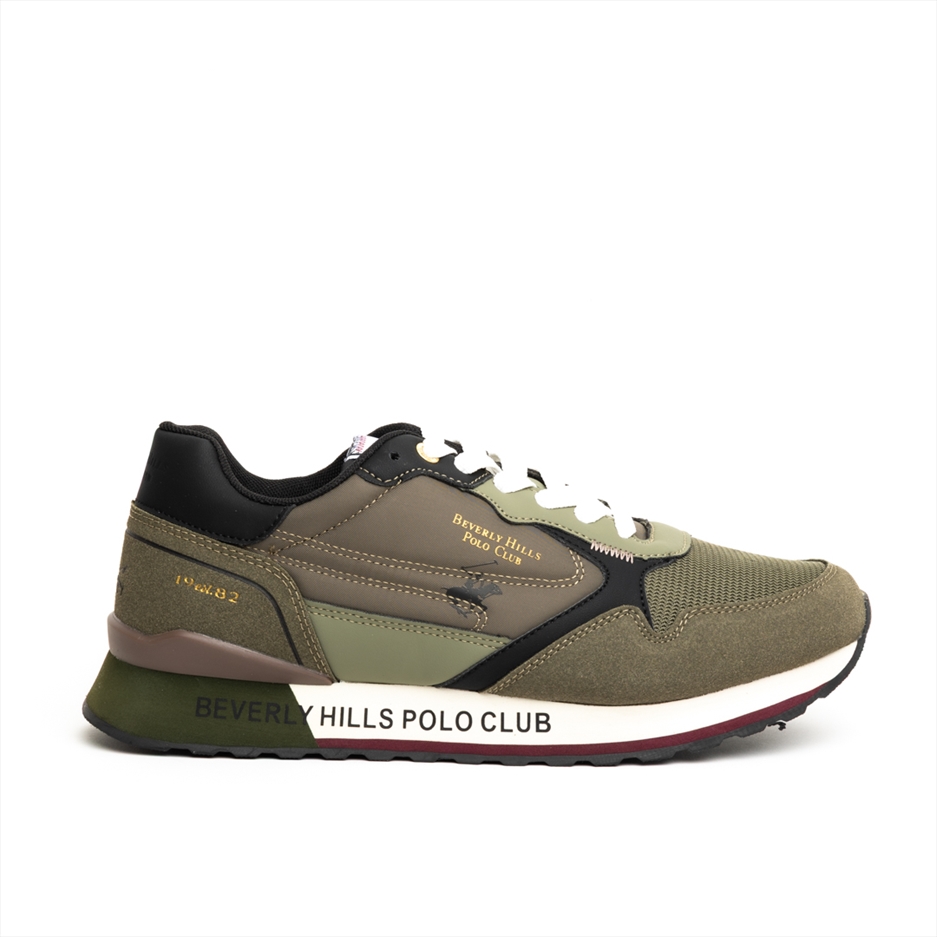 These men’s Beverly Hills Polo Club trainers combine sporty style with everyday comfort. Crafted in a mix of olive green suede effect and textile panels, they feature contrasting black and brown details for a modern, versatile look. The side is decorated with the brand logo, while the midsole branding adds a bold finishing touch. A cushioned insole and lightweight sole ensure comfort throughout the day, while the textured rubber outsole provides reliable grip. Designed with lace-up fastening and supportive heel reinforcement, these trainers are perfect for both casual outings and active days. Available in green.