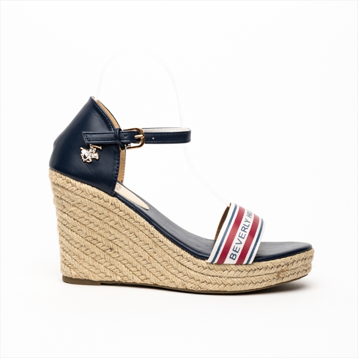 High wedge espadrilles are a must-have in every woman’s wardrobe during the Spring / Summer season, and what better edition than these Beverly Hills Polo Club sandals? With a toe strap covering the front part of the foot decorated with branding and an enclosed heel section secured with an ankle strap, these sandals are topped off with the iconic Beverly Hills Polo Club pony logo sitting on the outside of the heel engraved on hardware. Available in white and navy.
