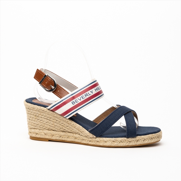 A touch of summer with these Beverly Hills Polo Club criss-cross sandals. Created with the perfect shade of navy, these sandals match incredibly well with a pair of loose blue jeans and a white shirt. The branding is evidently present across the vamp of the foot, giving off an American aesthetic with the touches of red and white. A clashing brown, leatherette ankle strap for additional security with an espadrille low wedge sole to tie the look together. Available in navy.