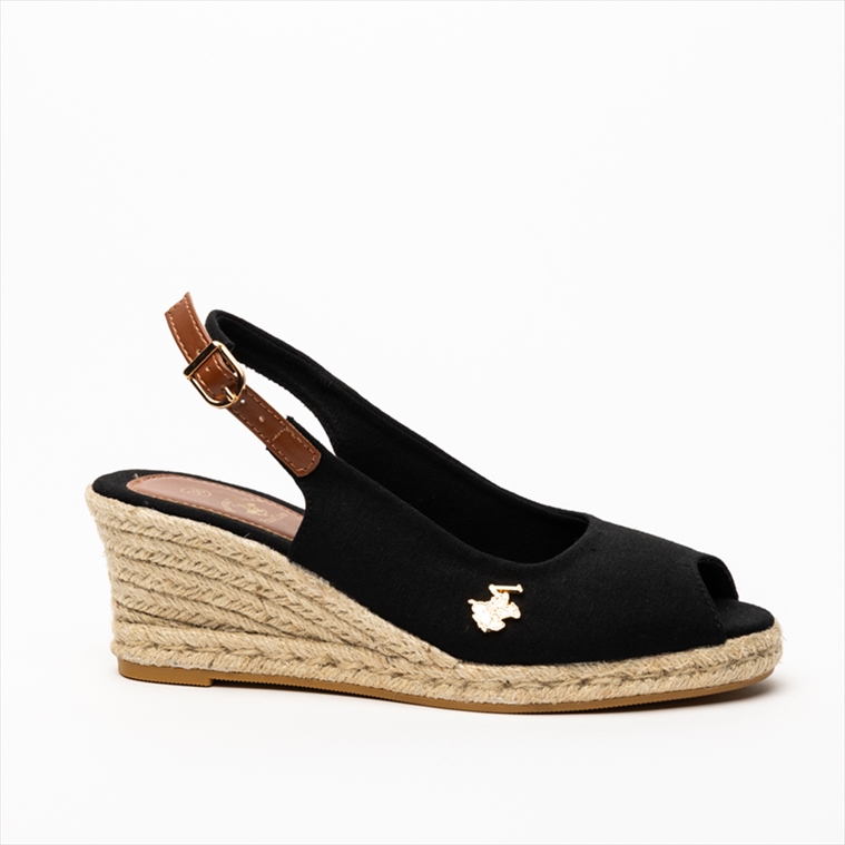 Peep-toe sling-back combo? Yes please! These Beverly Hills Polo Club sandals guarantee to keep you comfy and stylish all throughout the Spring/ Summer season. Crafted with a soft yet sturdy canvas upper, a clashing brown, leatherette ankle strap completes this sling-back design. The iconic Beverly Hills Polo Club pony logo sits on the outside of the upper engraved on hardware, sitting on top of a weaved, espadrille low wedge sole providing you with just the right amount of height and comfort. Available in white and black.