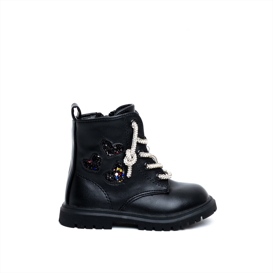 These girls’ combat boots bring a perfect mix of edgy style and playful sparkle. Featuring dazzling silver stone laces and a sparkling hearts detail on the side, they add a fun, fashionable touch to any outfit. Durable, comfortable, and full of personality, these boots are perfect for school, outings, or any adventure where style matters Available in black.