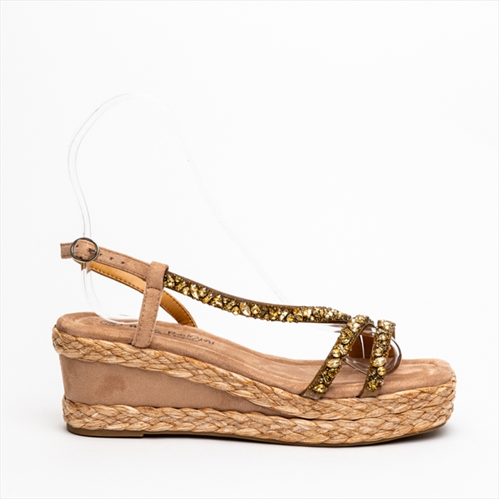 The perfect summer look includes a combination of suedette with espadrille. Crafted with carefully selected materials, this medium wedge heel gives you just the right amount of height and comfort for your summer looks. A strappy sandal embellished with rhinestones for extra glam. Available in beige with gold rhinestones and silver with matching rhinestones.