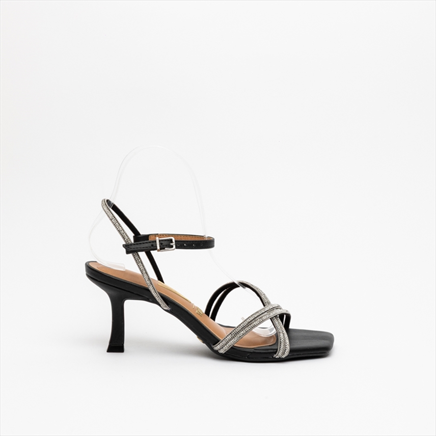 The 6 cm flare heel provides just the right amount of lift while ensuring stability for all-day wear. Delicate cross straps adorned with subtle embellishments add a touch of sophistication and sparkle, making them ideal for both daytime outings and evening occasions. An adjustable ankle strap ensures a secure and comfortable fit, giving you confidence with every step. Whether paired with dresses, skirts, or tailored trousers, these sandals are a versatile addition to any wardrobe. Available in black.